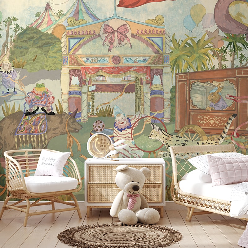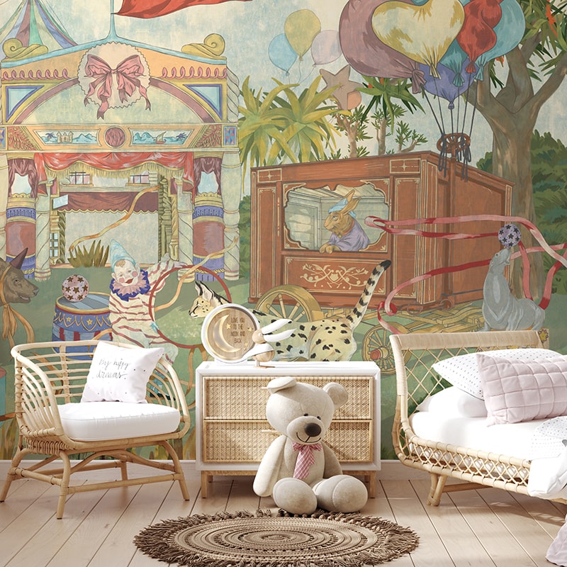 Acest tapet Vintage Bazaar adaugă o notă de farmec și nostalgie oricărei camere. Cu un design vibrant, care prezintă un circ cu un clovn amuzant, animale drăguțe și baloane colorate, acest tapet va transforma pereții casei tale într-o oază de magie și aventură. Realizat cu materiale de înaltă calitate, acest tapet este rezistent și ușor de curățat, asigurându-vă că frumusețea lui va dura mult timp. Alegeți acest tapet pentru a crea o atmosferă unică și a adăuga un strop de personalitate casei dumneavoastră.