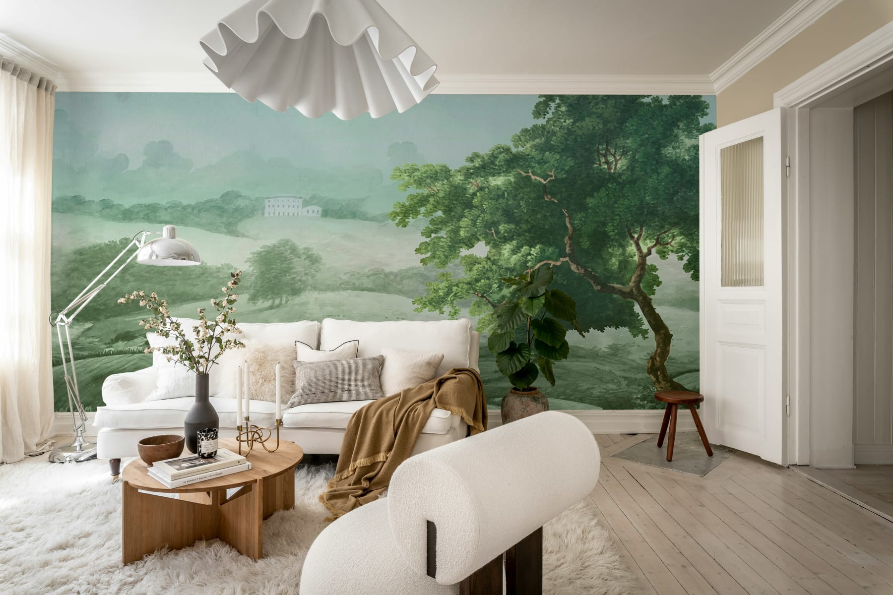 Vintage Tree, Green încapsulează prospețimea luxuriantă a unui peisaj verde, invitând liniștea unei păduri învăluite în ceață în spațiul tău. Acest design de tapet prezintă un copac impunător, scăldat în nuanțe delicate de verde, pe un fundal de coline unduitoare și cețuri matinale. Paleta sa liniștitoare și imaginile serene sunt perfecte pentru crearea unei atmosfere pașnice, fiind ideal pentru dormitoare, spații de meditație sau orice cameră unde calmul este esențial. Acest design face legătura între frumusețea sălbatică a naturii și eleganța rafinată a artei vintage.