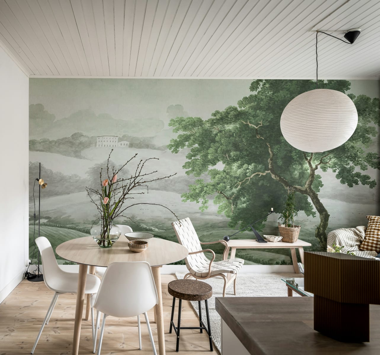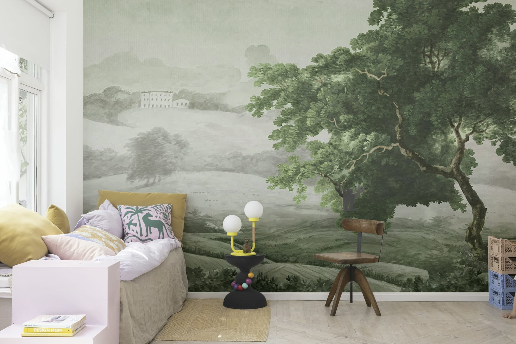 Vintage Tree, Soft Green întruchipează esența senină a unui peisaj atemporal, scăldat în nuanțele delicate ale primăverii timpurii. Acest tapet fermecător prezintă un copac străvechi, cu ramurile sale întinse, conturate pe coline cețoase, redat în nuanțe liniștitoare de verde. Paleta de culori blânde evocă un sentiment de pace și reînnoire, fiind alegerea ideală pentru spațiile dedicate relaxării și contemplării. Perfect pentru dormitoare, colțuri de lectură sau orice interior care necesită o notă de frumusețe liniștită a naturii, acest design invită la calm și inspiră o conexiune profundă cu lumea naturală.