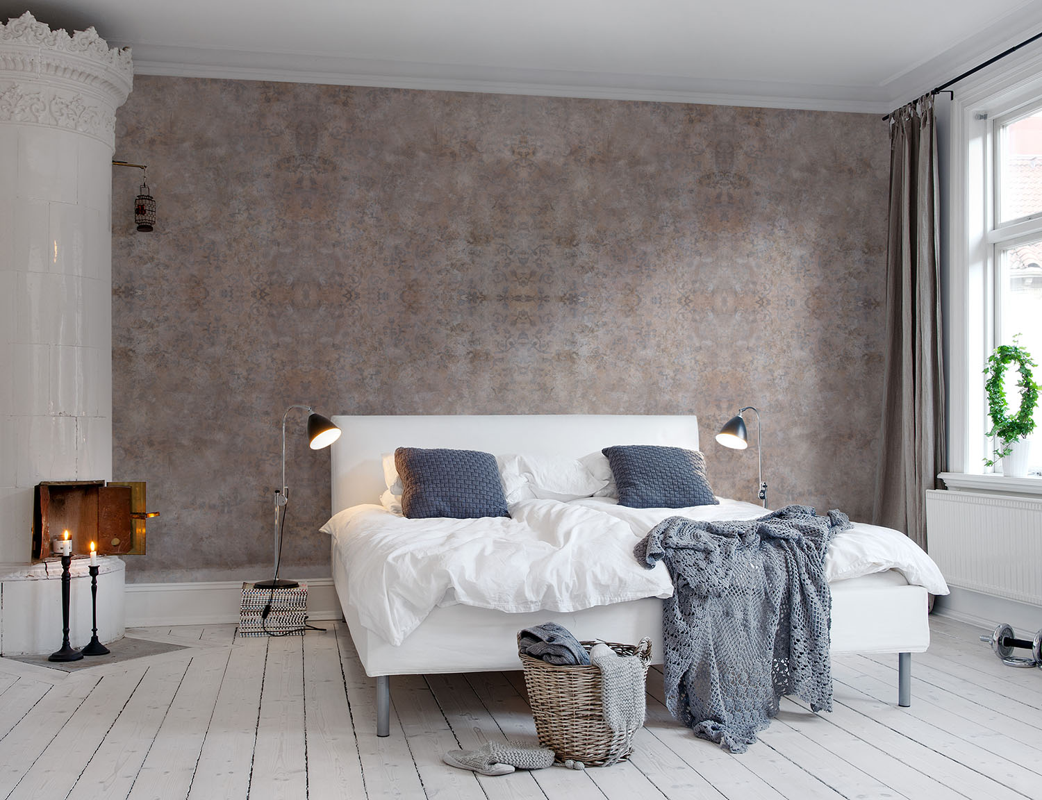 Un fototapet elegant, patinat, în culori șterse care se potrivește unei case cu multă personalitate. În spatele straturilor de vopsea albă se află un ornament iar design-ul fototapetului este unul vechi dar în același timp nou.