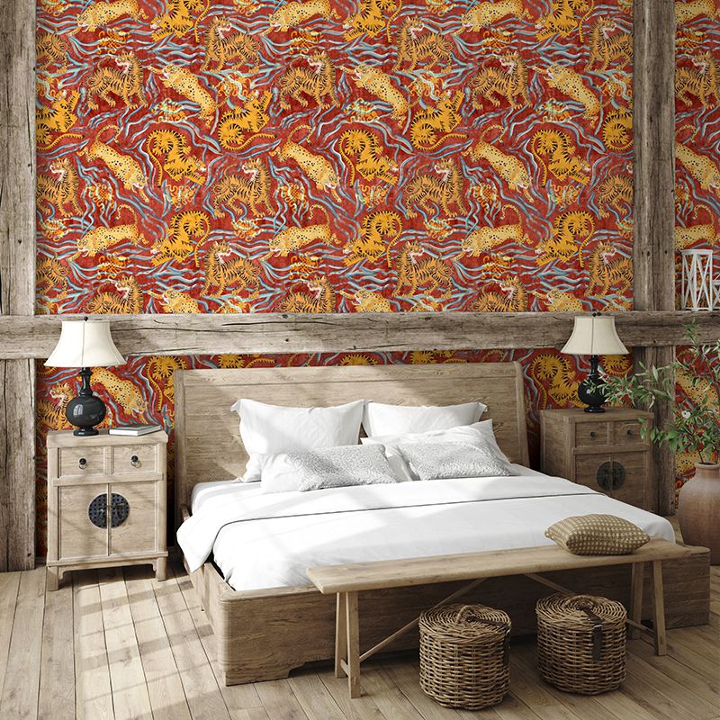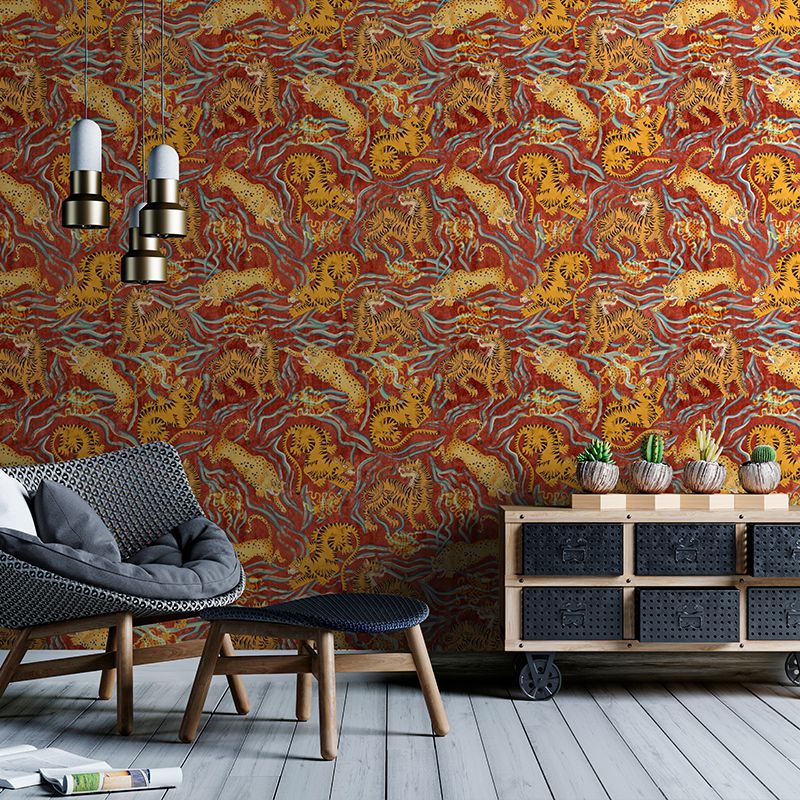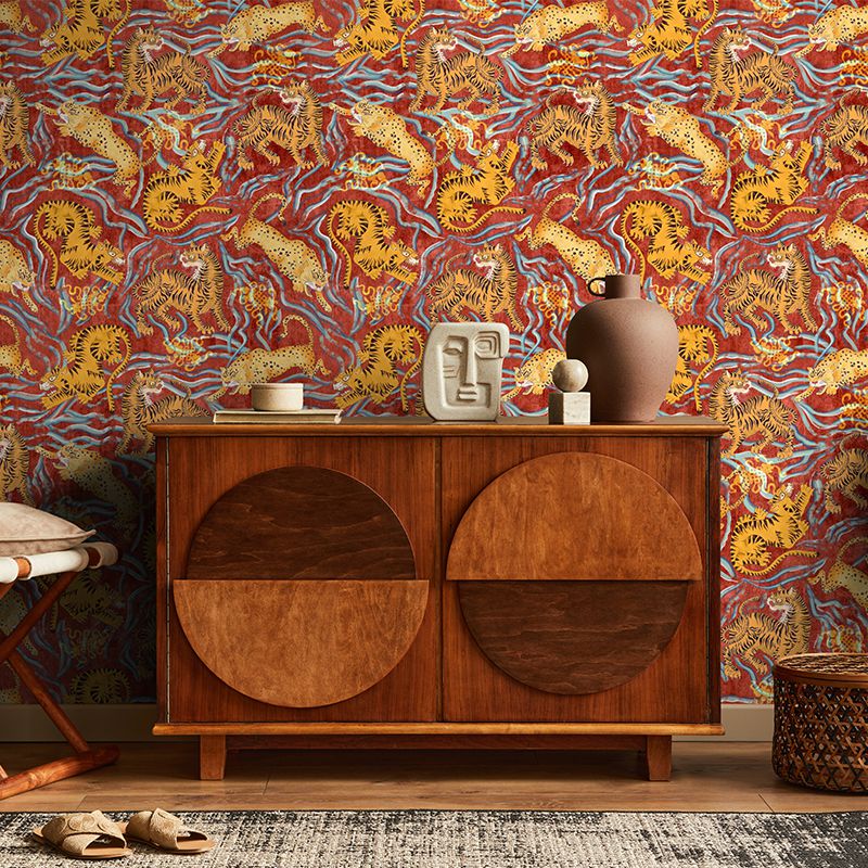 Adaugă un strop de sălbăticie casei tale cu Waghoba Scarlet, un tapet cu un model vibrant de tigri, pe un fond roșu aprins. Acest tapet unic este perfect pentru a crea un accent spectaculos în orice cameră, de la living la dormitor. Cu tigri stilizați și un design modern, Waghoba Scarlet va aduce o notă de eleganță și originalitate în decorul dumneavoastră.