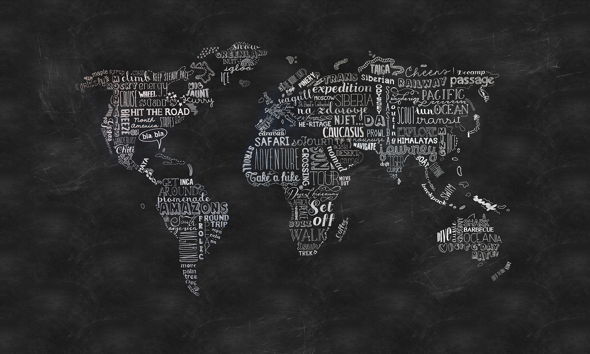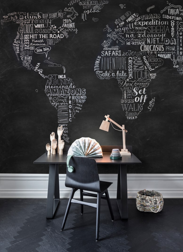 Cauți inspirație și curaj pentru următoarea călătorie? Atunci nu va trebui să petreci mult timp în fața acestui fototapet până nomadul din tine se va trezi. Tipografie frumoasă, desenată de mână pe fundal negru. Pornește la drum!