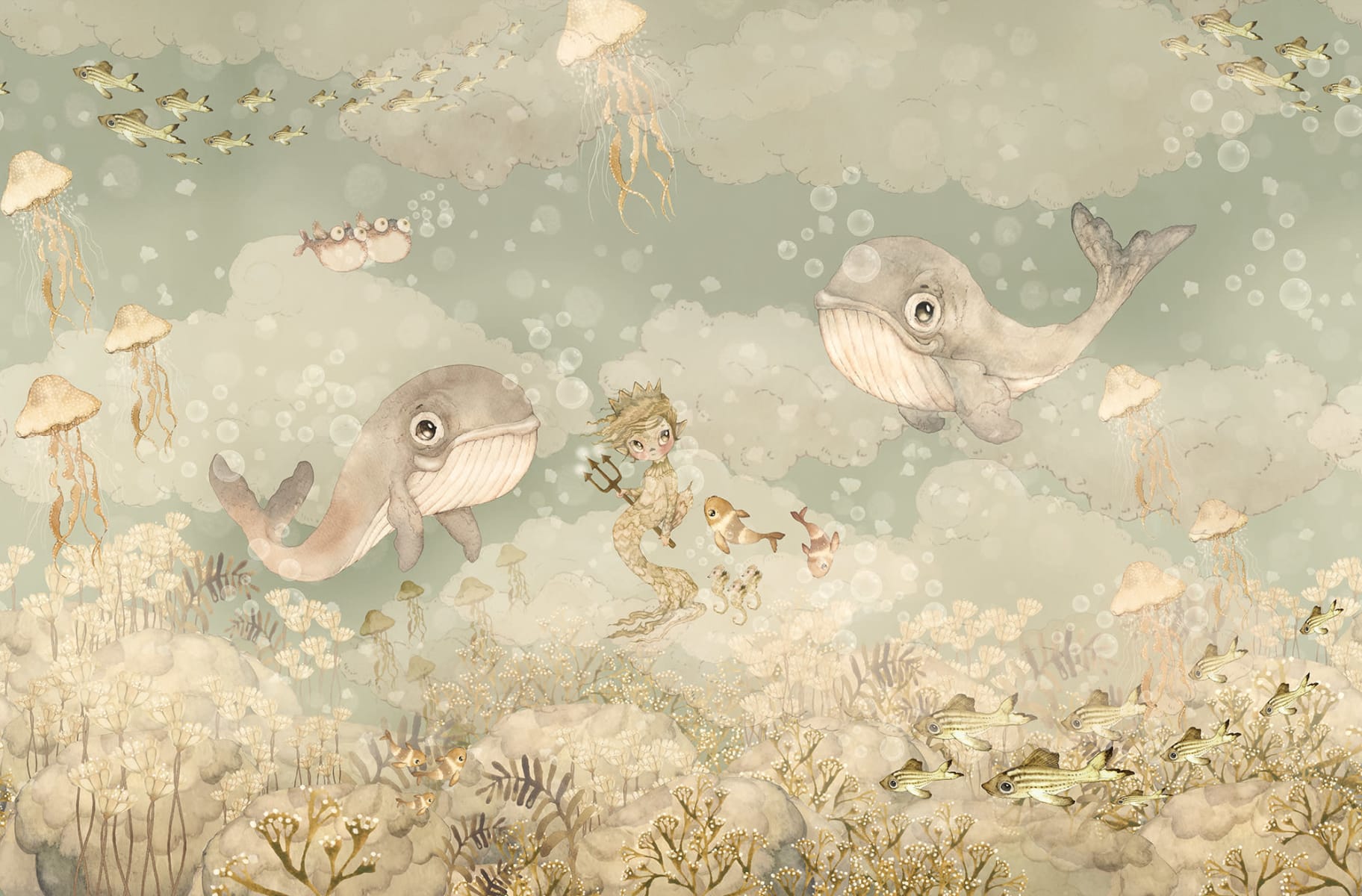 Descoperă lumea subacvatică magică și plină de bule a creaturilor fermecate. Povestește micilor tăi rebeli despre peștișorii jucăuși și balenele gigantice și prietenoase. Fundalul perfect pentru povești de seară pline de aventură! Varianta de culoare Aqua Green vine în nuanțe pale de verde aqua pastel, gri deschis, alb murdar și verde viu.