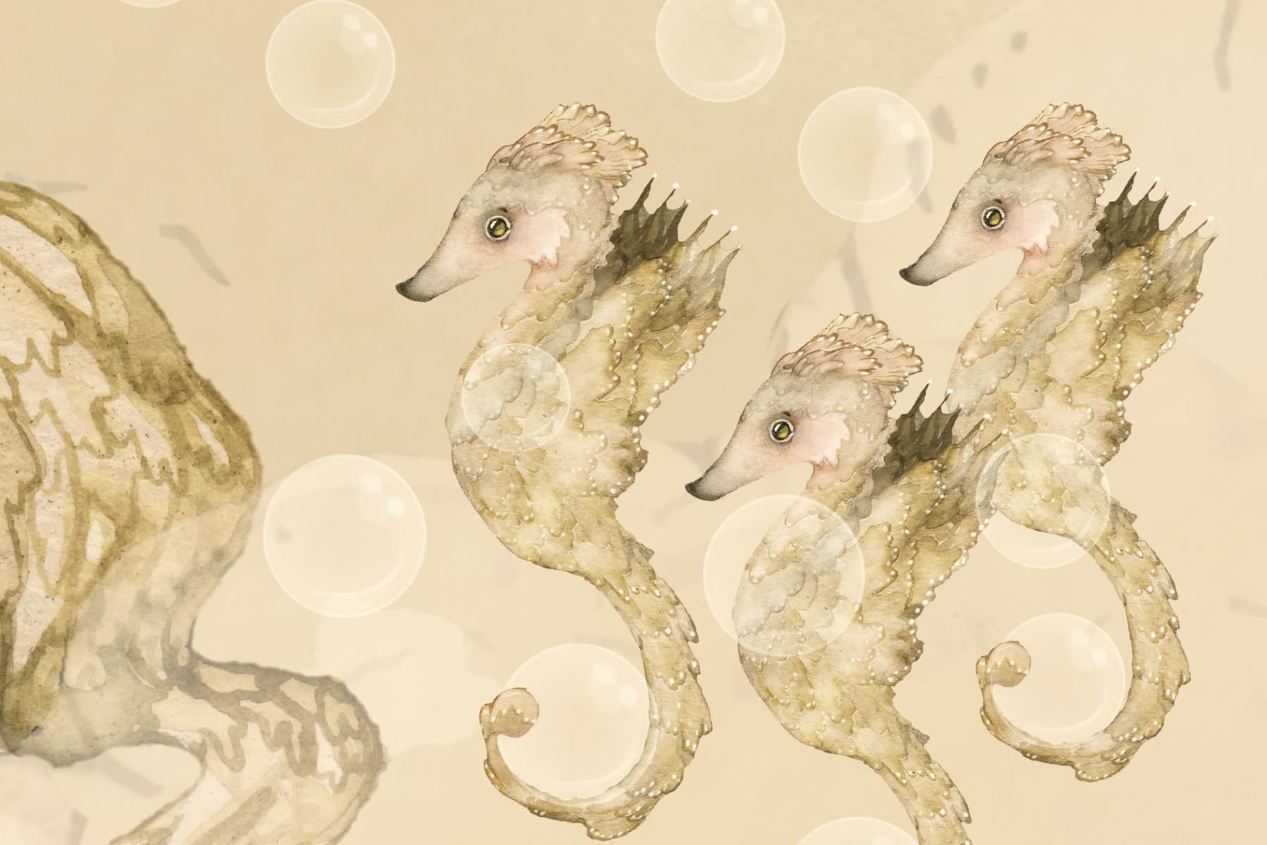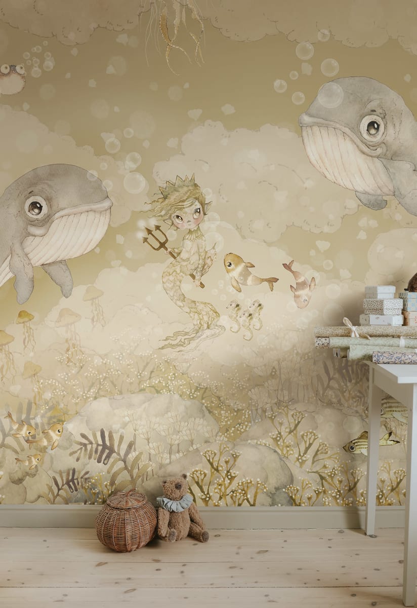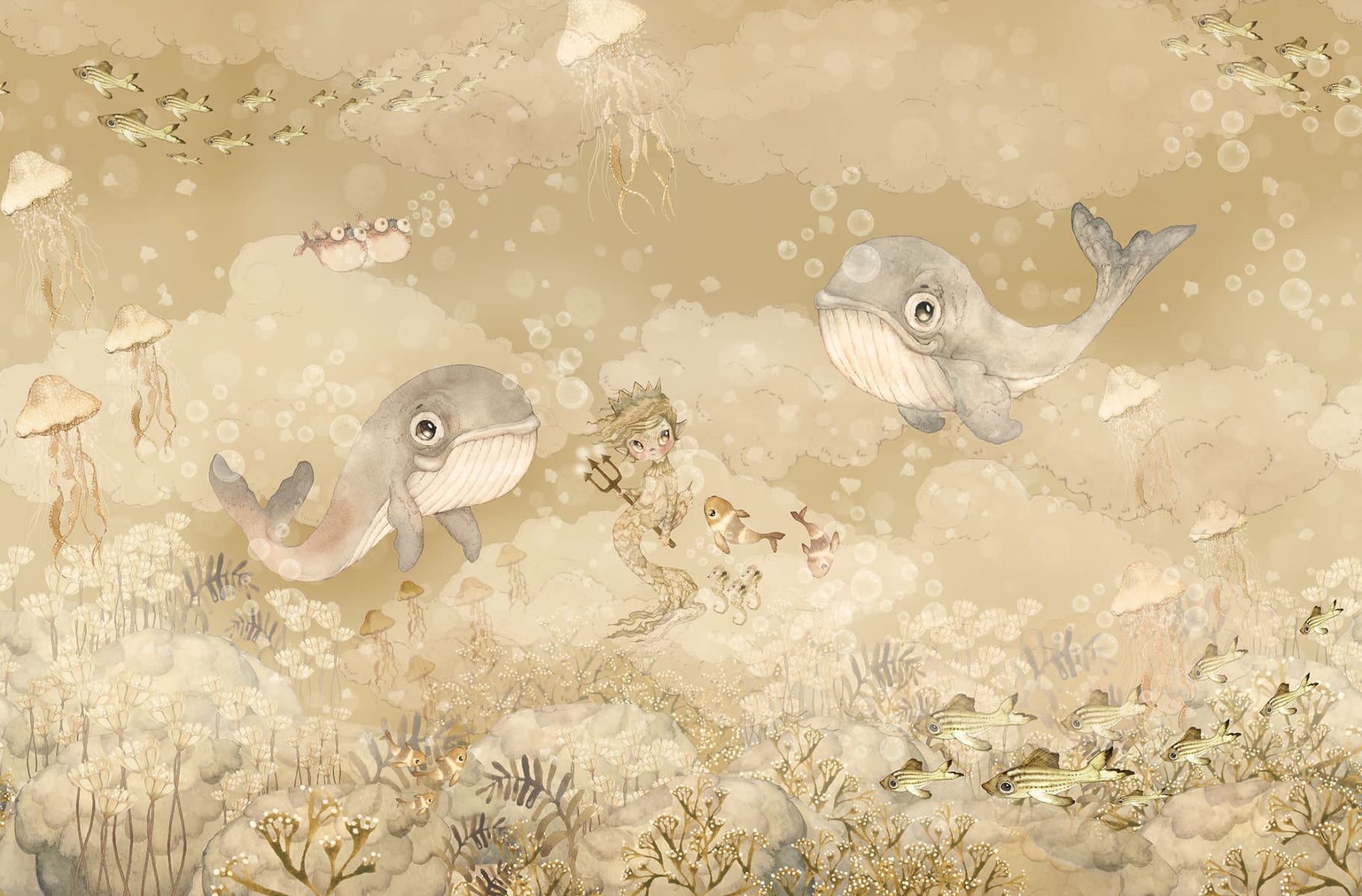 Descoperă lumea subacvatică magică și plină de bule a creaturilor fermecate. Povestește micilor tăi rebeli despre peștișorii jucăuși și balenele gigantice și prietenoase. Fundalul perfect pentru povești de seară pline de aventură! Varianta de culoare Sand vine în nuanțe calde de bej, gri deschis, alb murdar, albastru deschis și verde viu.