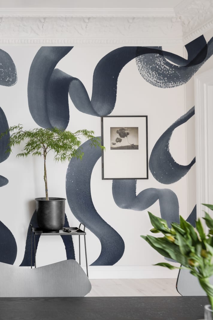 O pensulă încrezătoare în cerneală face din acest tapet un detaliu îndrăzneț, dar echilibrat.