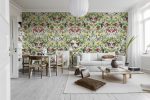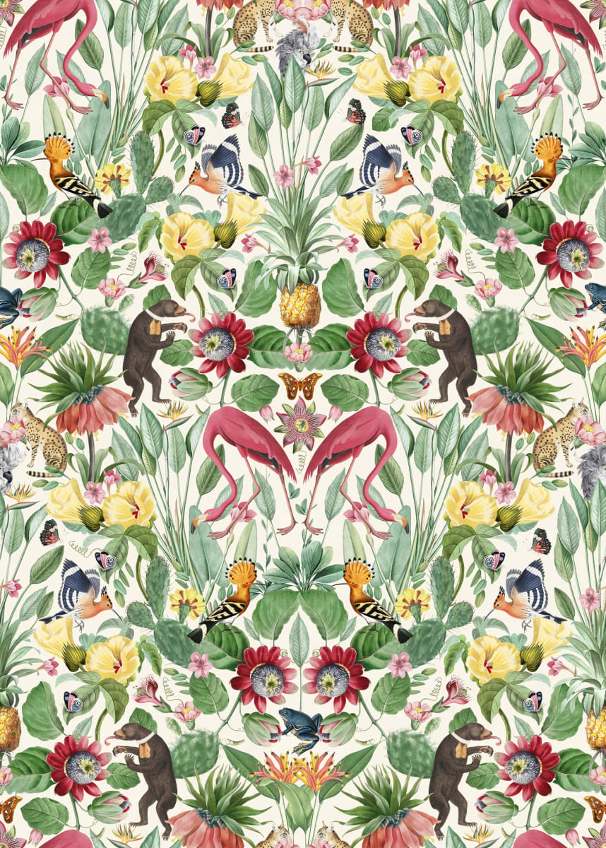 Whimsical Jungle, Day – o călătorie plină de entuziasm în adâncurile tropicale ale naturii, chiar în confortul propriei case. Acest tapet unic prezintă o măreție care îmbină perfect exoticul cu florile, cu frunzișul verde luxuriant și delicat, păsările flamingo maiestuoase pe un fundal deschis. Fiecare centimetru al tapetului este o dovadă a frumuseții naturii, proiectată meticulos pentru a aduce o tentă tropicală în decorul tău interior.
