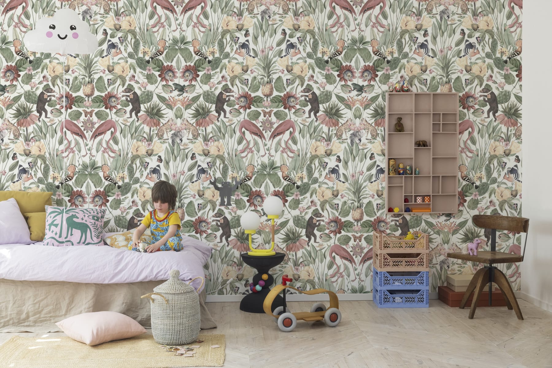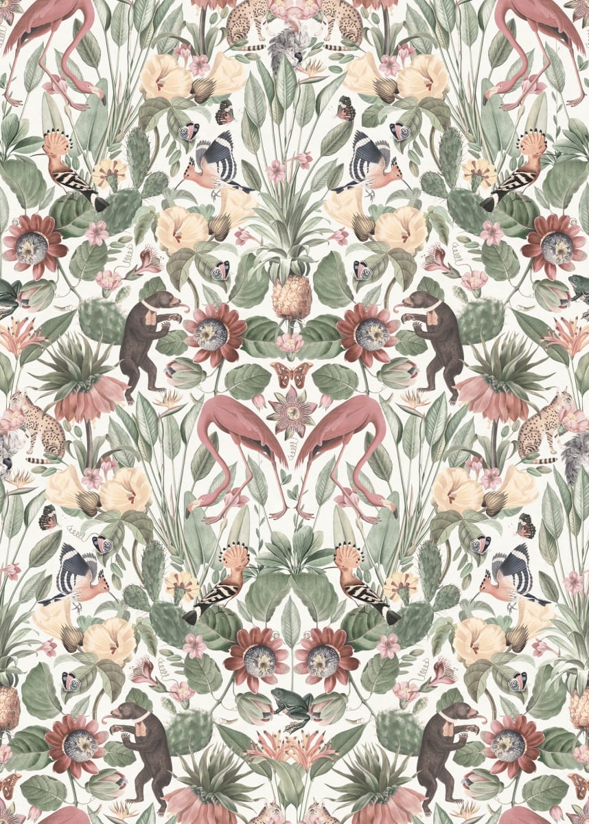 Whimsical Jungle, Pastel – o călătorie plină de entuziasm în adâncurile tropicale ale naturii, chiar în confortul propriei case. Acest tapet unic prezintă o măreție care îmbină perfect exoticul cu florile, cu frunzișul verde luxuriant și delicat, păsările flamingo maiestuoase pe un fundal pastelat. Fiecare centimetru al tapetului este o dovadă a frumuseții naturii, proiectată meticulos pentru a aduce o tentă tropicală în decorul tău interior.