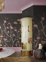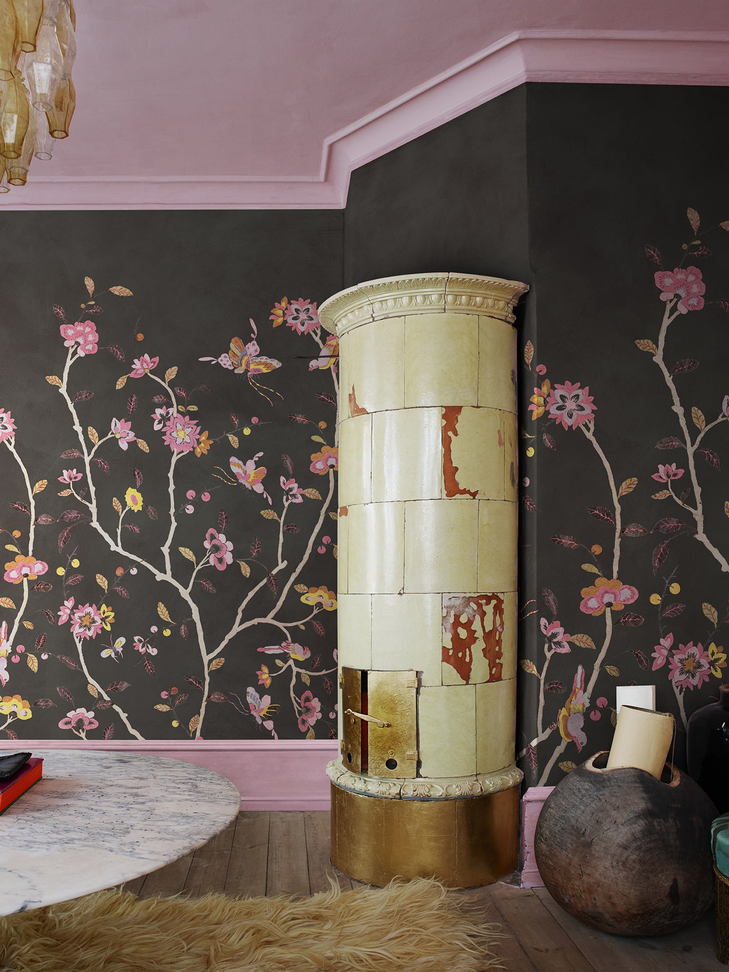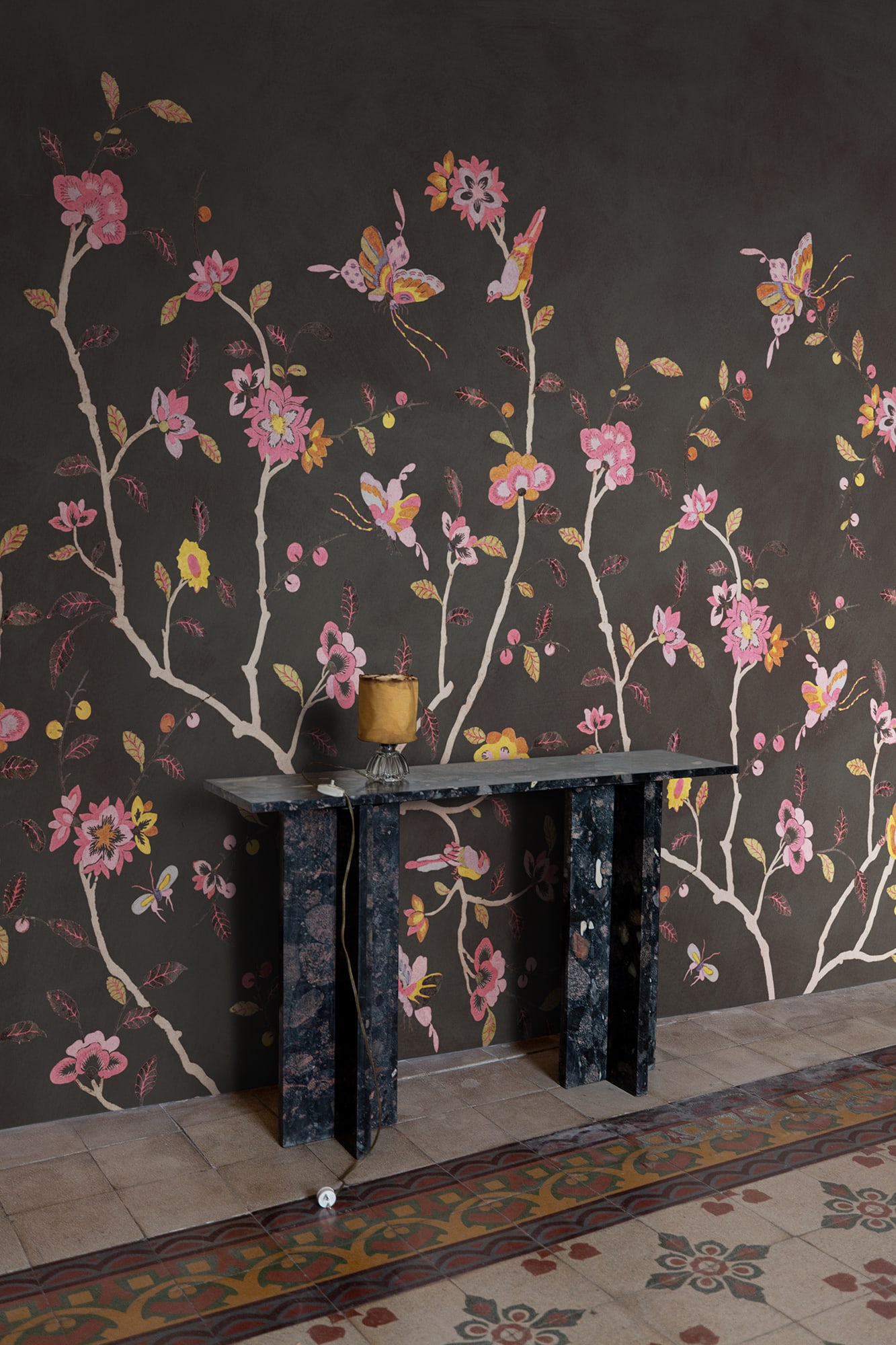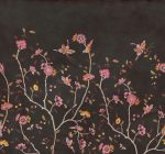 Whispering Petals se bazează pe un original vintage pictat manual, reimaginat și transformat într-un model repetabil, fără cusături. Ramuri delicate cu flori moi și fluturi fluturând creează o atmosferă senină și atemporală. Perfect pentru a adăuga o notă de artă rafinată și farmec vintage pereților dvs. Culoarea Black are o bază vie, neagră și un model în nuanțe vii de roz, liliac, gri, maro și portocaliu.