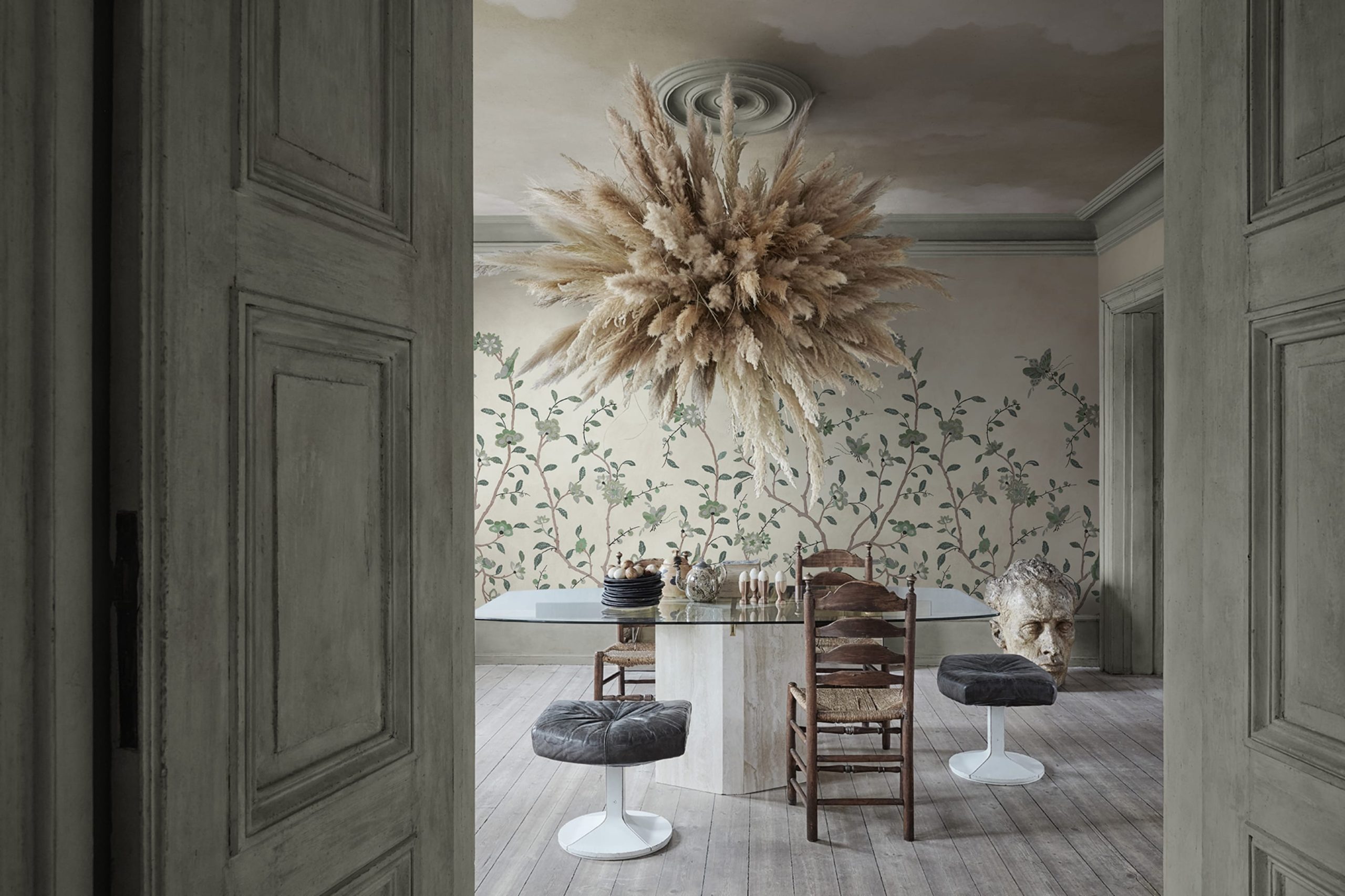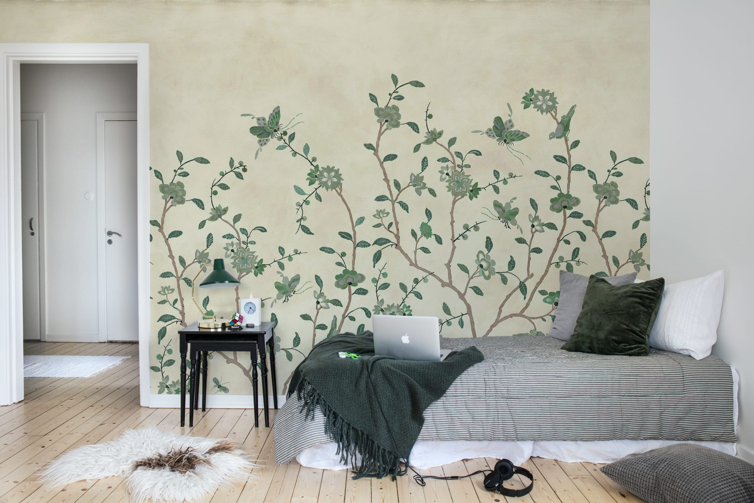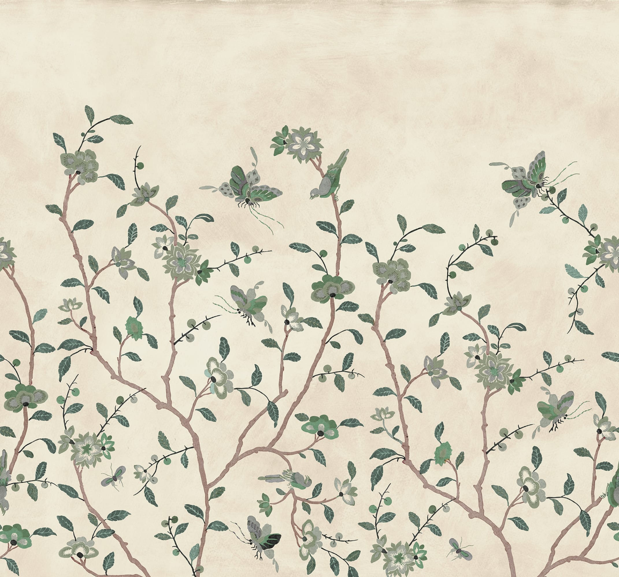 Whispering Petals se bazează pe un original vintage pictat manual, reimaginat și transformat într-un model repetabil, fără cusături. Ramuri delicate cu flori moi și fluturi fluturând creează o atmosferă senină și atemporală. Perfect pentru a adăuga o notă de artă rafinată și farmec vintage pereților dvs.