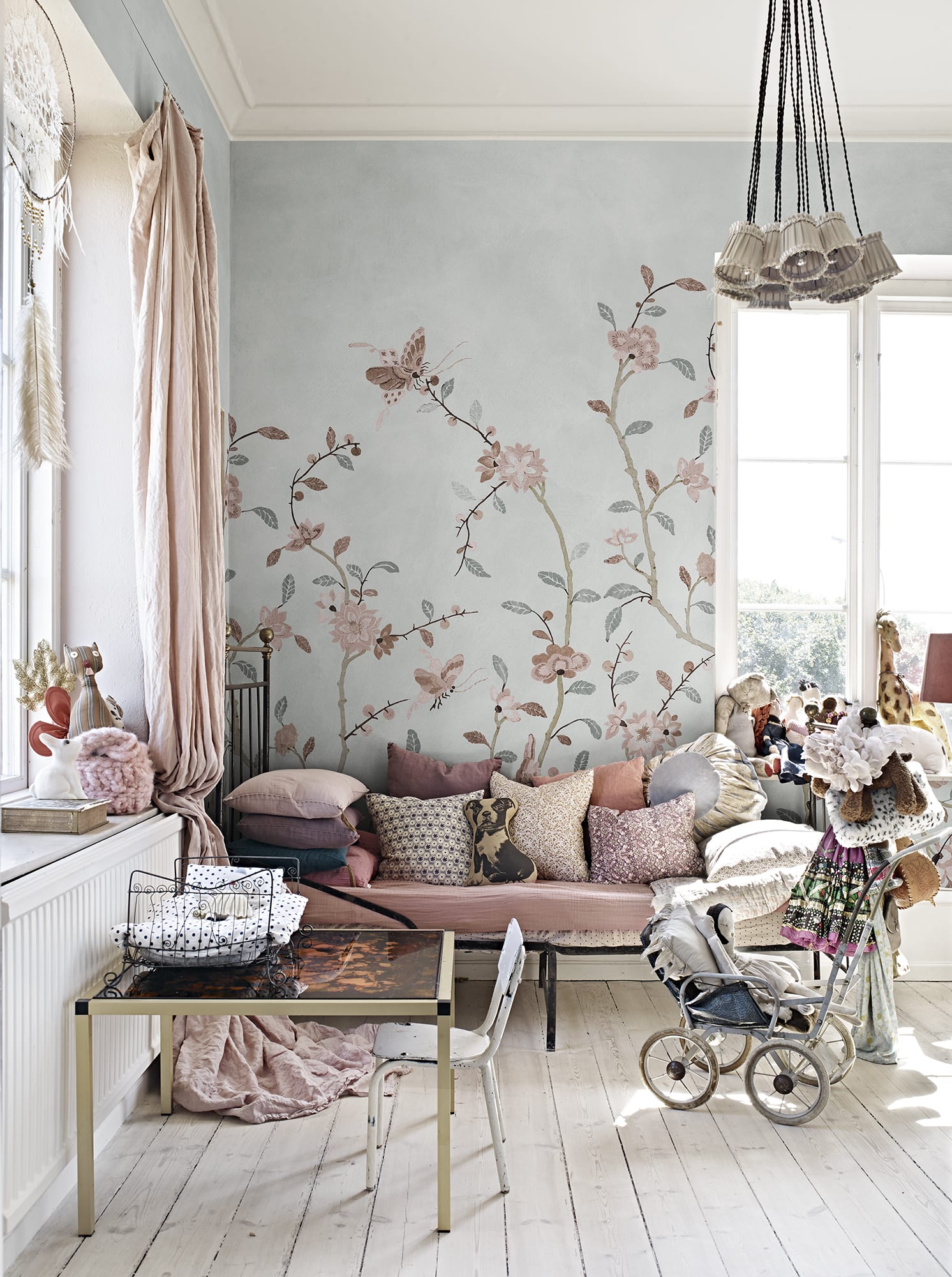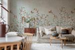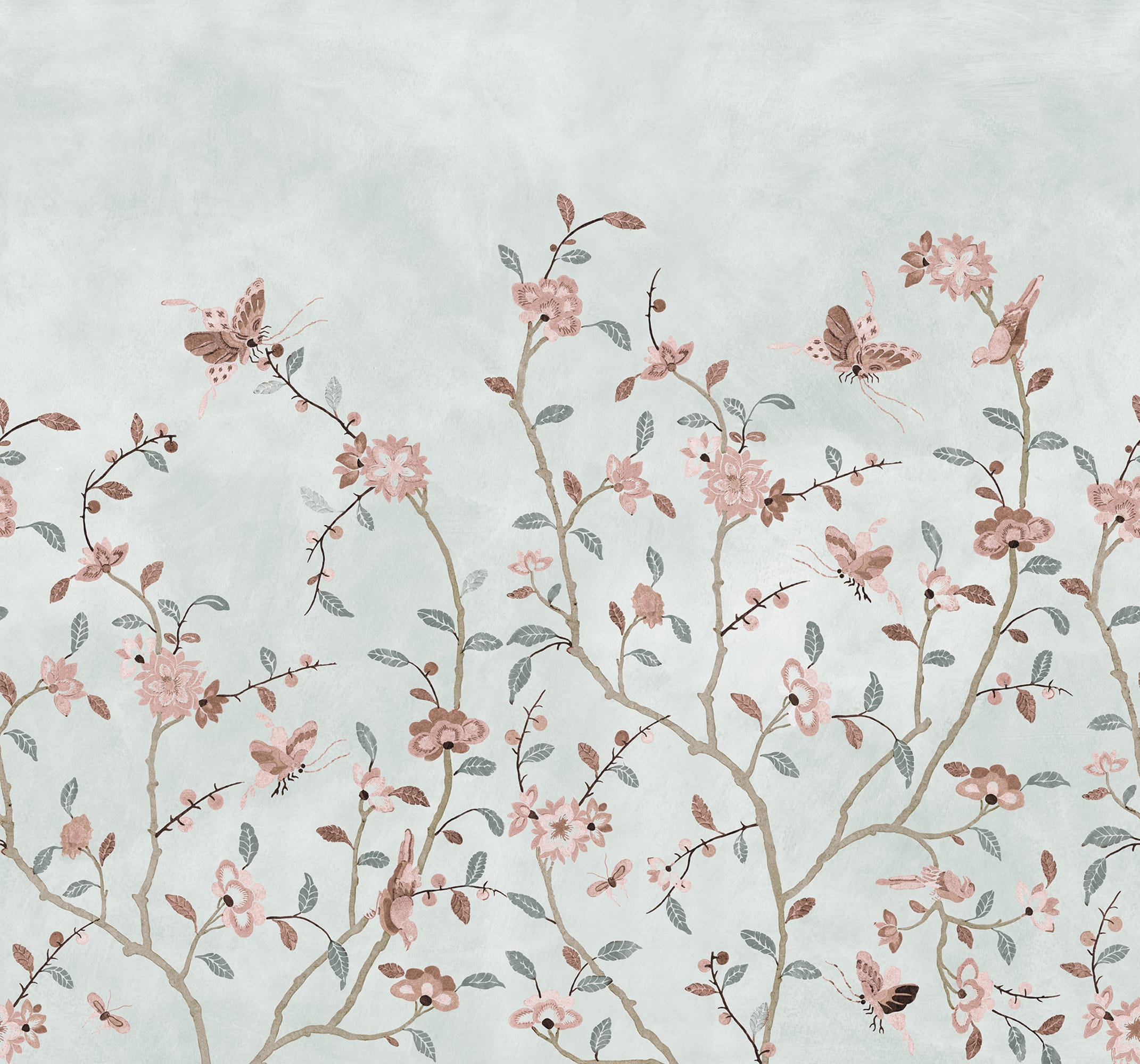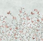 Whispering Petals se bazează pe un original vintage pictat manual, reimaginat și transformat într-un model repetabil, fără cusături. Ramuri delicate cu flori moi și fluturi fluturând creează o atmosferă senină și atemporală. Perfect pentru a adăuga o notă de artă rafinată și farmec vintage pereților dvs. Culoarea Light Blue are o bază vie albastru deschis și un model în nuanțe de maro, albastru, roz și negru.