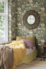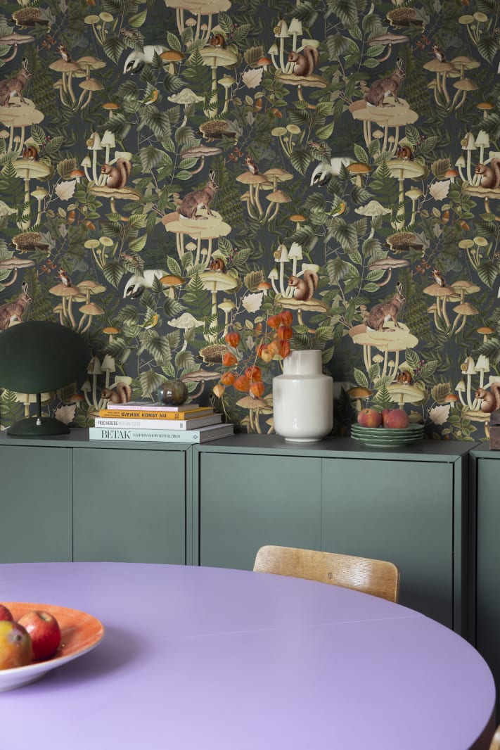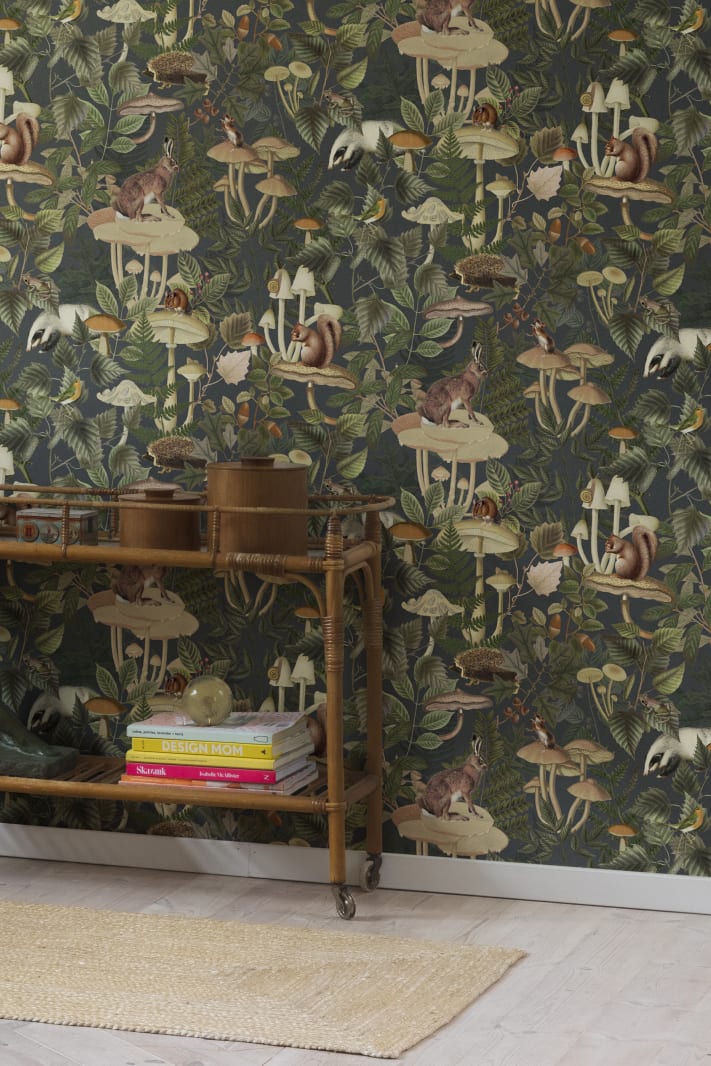 Înconjurate de paleta naturii, iepuri de câmp, arici, cătin și veverițe trăiesc adânc în pădure, printre ferigi asemănătoare cu pene și ciuperci curios. Wildlife Creek, Forest Green, are un fundal verde mai închis, un plus perfect pentru o casă, îndrăznind să-și revendice spațiul.