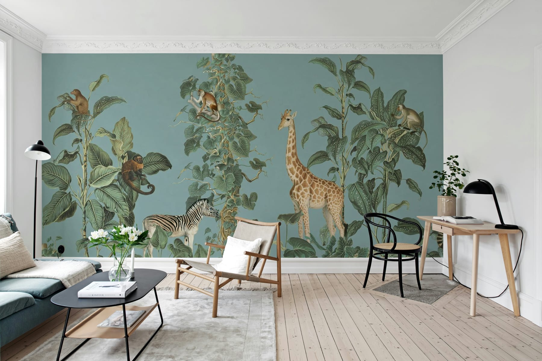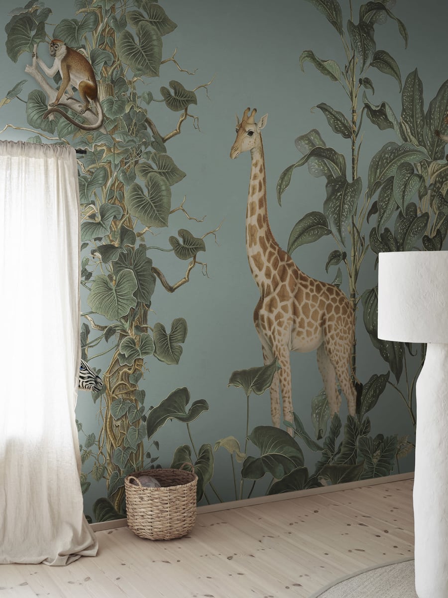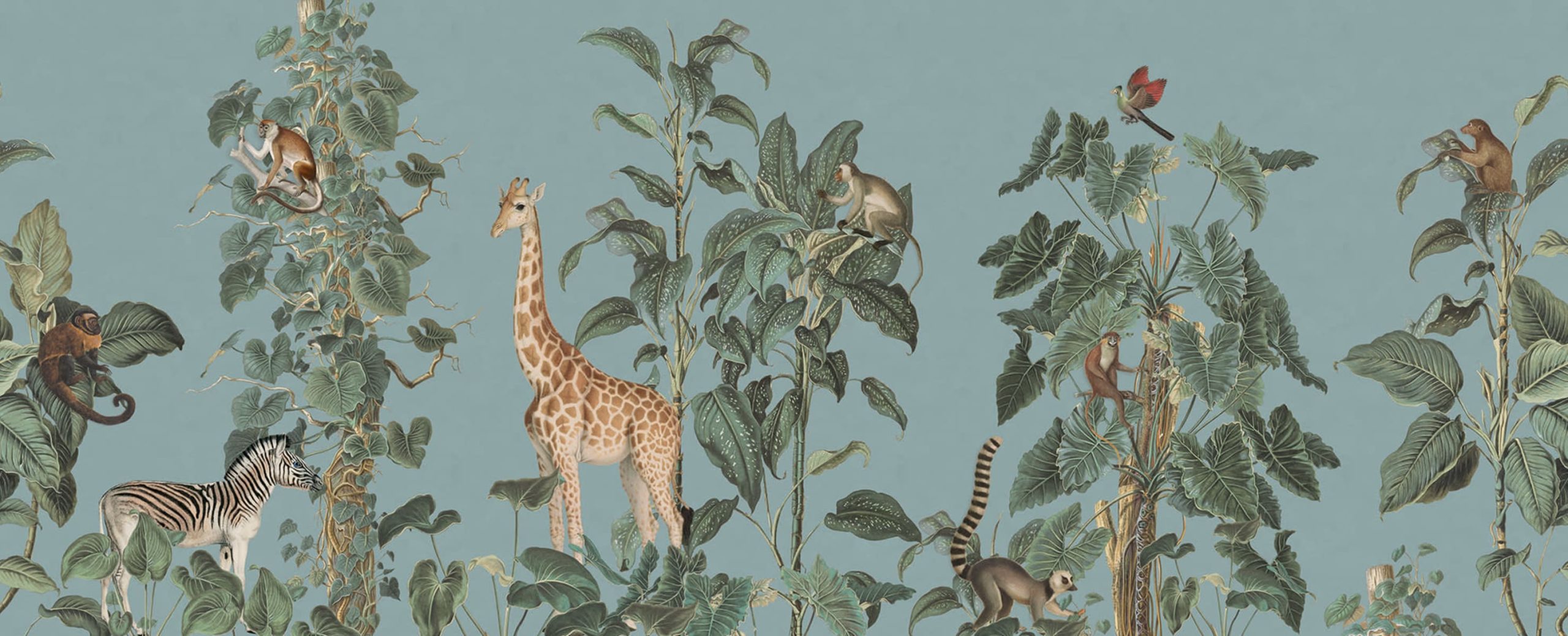Animalele din junglă se plimbă spre adăpătoare: o girafă, o zebră, un lemur și o maimuță, toate pictate frumos, cu mare atenție la detalii. Un fundal minunat pentru joacă și distracție în familie. Wildlife Stroll, Blue, are o bază albastră și un model verde, bej, maro și roșu cu mici detalii albe.