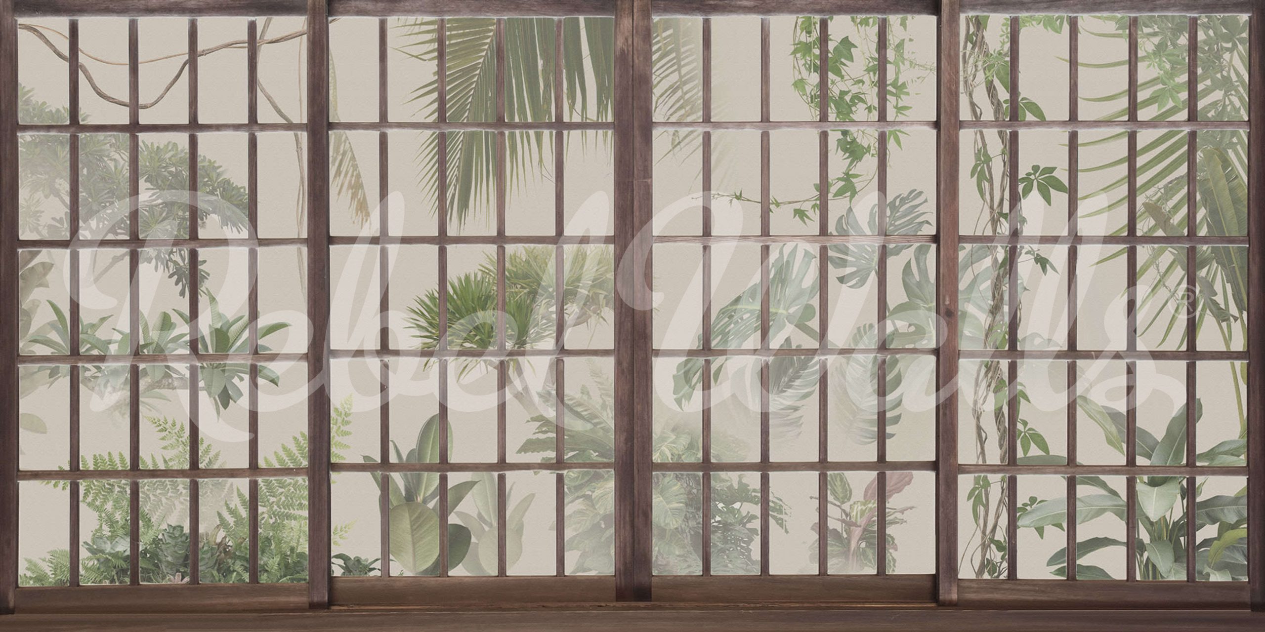 Tapetul Window View, Beige oferă o priveliște liniștită și pitorească a copacilor din junglă văzuți printr-o fereastră de lemn, creând iluzia unei evadări liniștite în natură, direct din confortul casei tale.