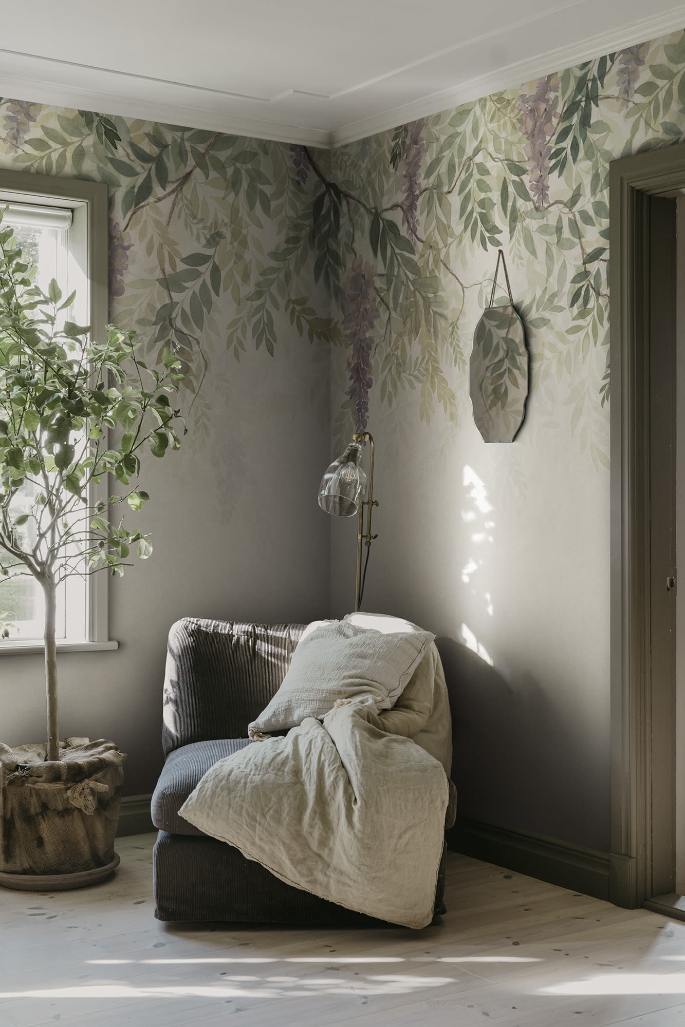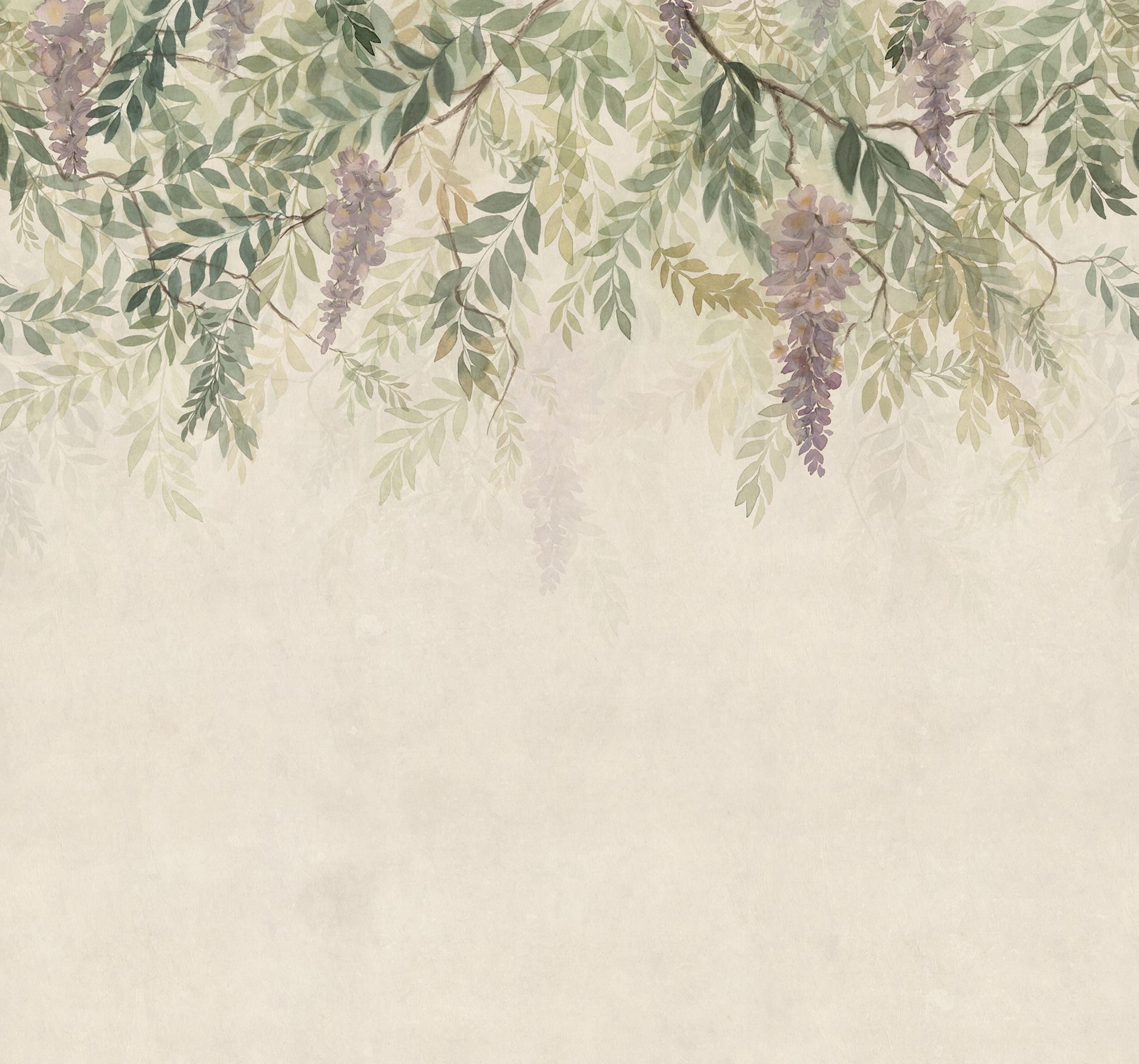 Dacă ați stat vreodată sub o glicină înflorită, cu frumoasele sale buchețele albastre, este greu să nu vă îndrăgostiți. Aduceți același sentiment în camera dvs. cu pictura murală Wisteria. Wisteria, Green, vine în tonuri moi de bej, verde și liliac.