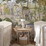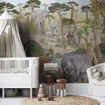 Jungle pattern tapet, VLAdiLA, featuring cheetahs leaping through lush palm trees on a black background. This stylish tapet will add