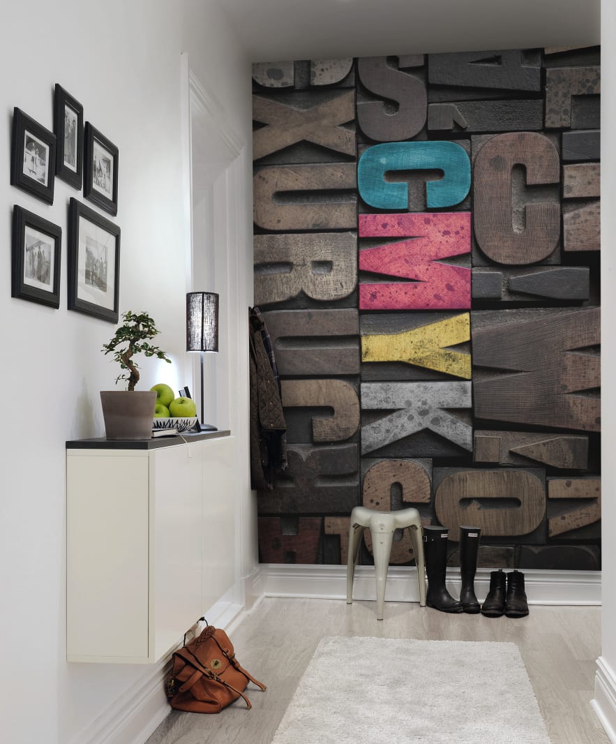 Fototapetul personalizat 3D Woodcut, Design, de la Rebel Walls, cu litere care par în relief, pe o suprafață care imită