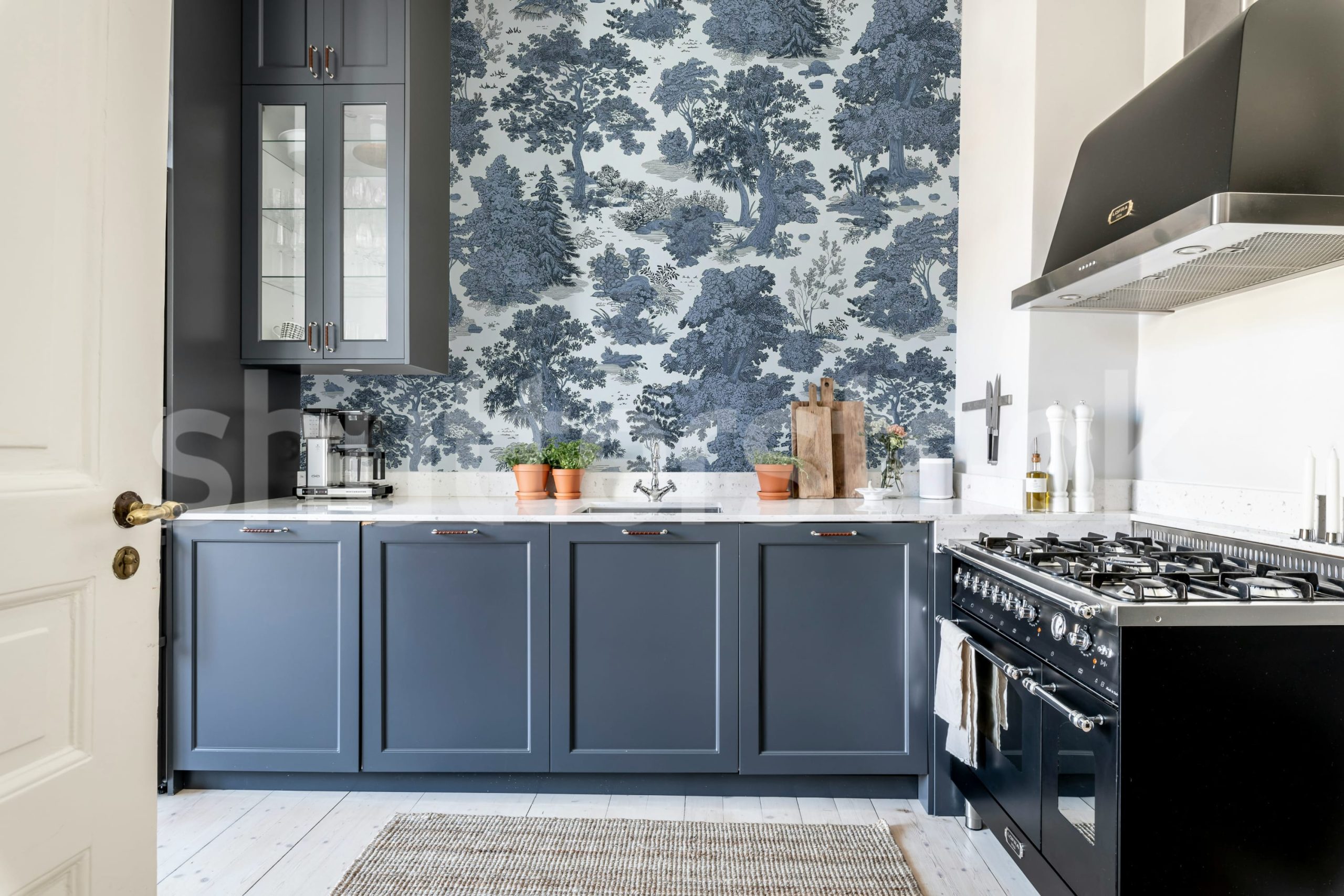 Acest tapet transformă orice cameră într-un peisaj idilic. Designul clasic, cu tonuri de albastru, adaugă o notă de eleganță subtilă și rafinament. Ideal pentru livinguri sau dormitoare, creează o atmosferă relaxantă și primitoare.