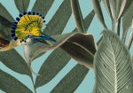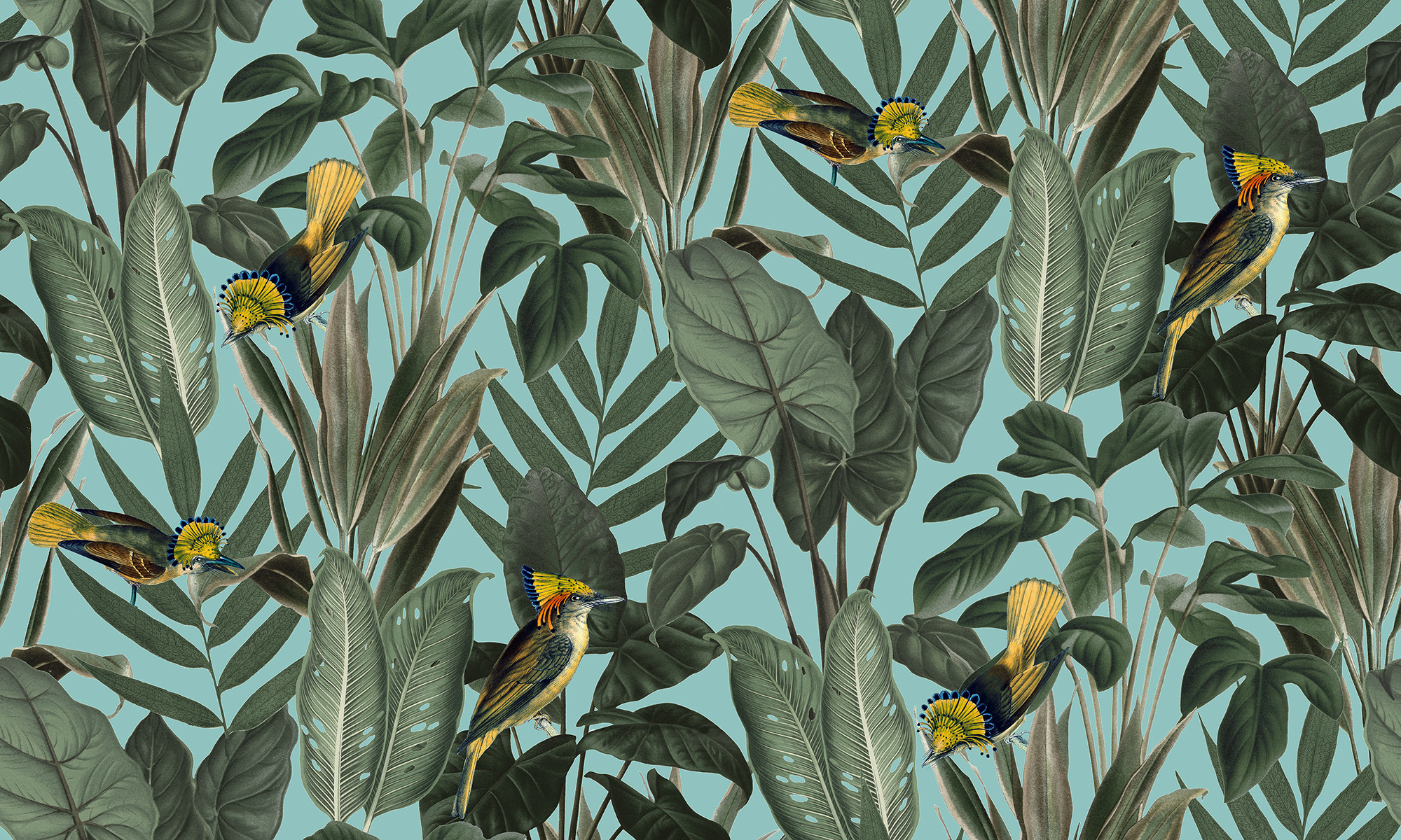 Păsările paradisului sunt niște creaturi exotice, mândre de frumusețea penajului lor. Un fundal turcoaz complimentează aceste păsări împreună cu frunzele verzi ale junglei.
