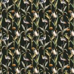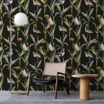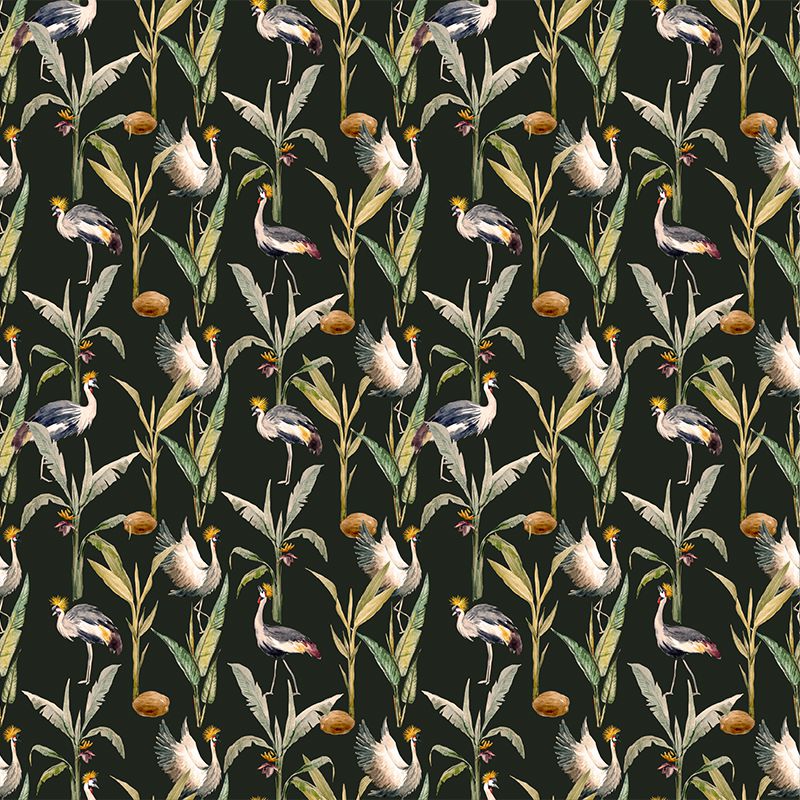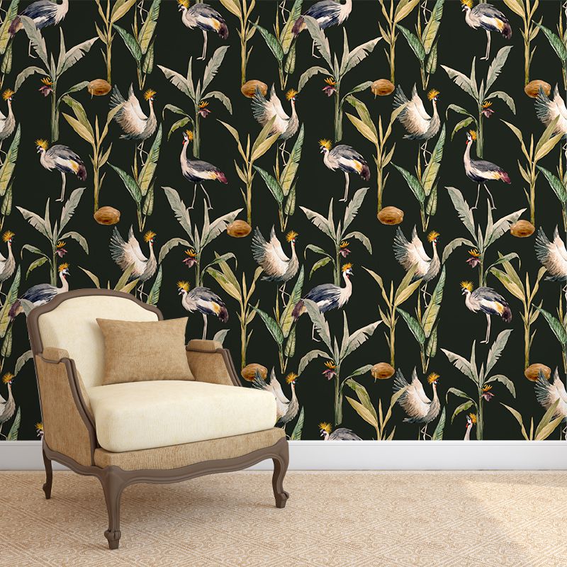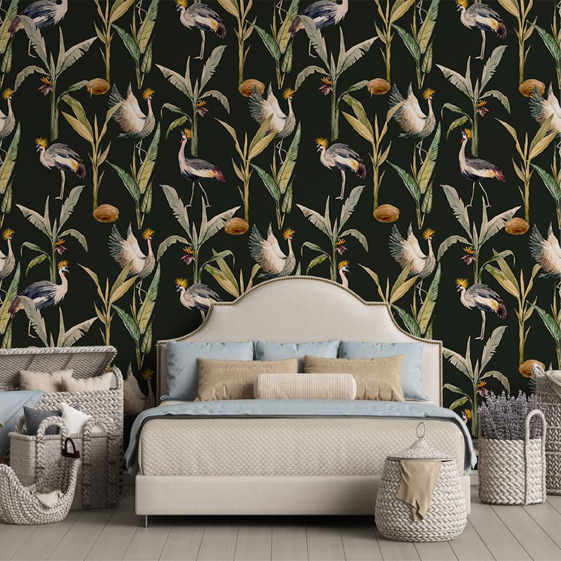Adaugă o notă exotică și vibrantă spațiului tău cu acest tapet cu un model tropical. Designul prezintă macarale elegante, palmieri tropicali și nuanțe calde de galben și violet, toate pe un fundal negru elegant. Acest tapet este perfect pentru a crea o atmosferă relaxantă și primitoare în sufragerie, dormitor sau birou.