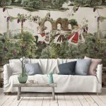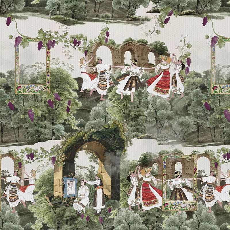 Zâne în rochii tradiționale dansează printr-o grădină luxuriantă cu viță de vie și arcuri. Acest tapet cu textură de pânză va aduce un aer romantic și boem în orice cameră, transformând-o într-un spațiu fermecător și vibrant. Inspirat de folclorul românesc, designul unic al acestui tapet adaugă o notă de magie și tradiție oricărui interior.