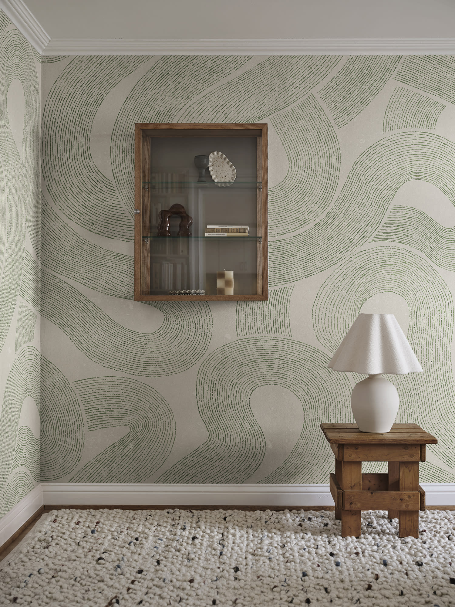 La fel ca nisipul modelat de mare, pictura murală Zen cu modele mari creează o expresie grafică, dar liniștitoare și un decor atemporal, contemporan. Schema de culori, Green, are o frumoasă bază caldă, structurată de bej nisip și linii verzi.