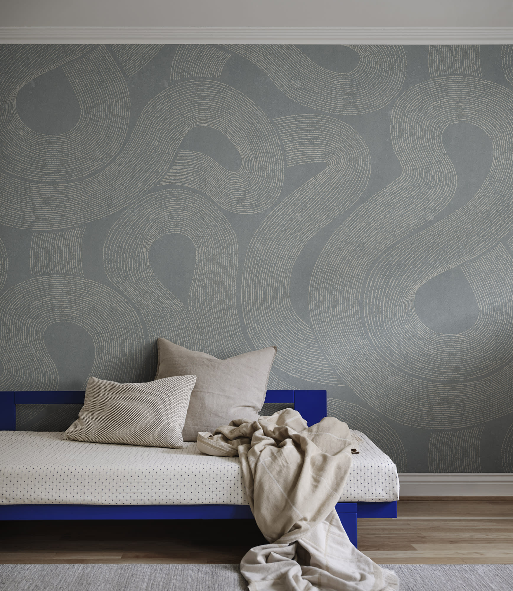 La fel ca nisipul modelat de mare, pictura murală Zen cu modele mari creează o expresie grafică, dar liniștitoare și un decor atemporal, contemporan. Schema de culori, Misty Blue, are un fundal frumos structurat albastru cețos și linii bej.