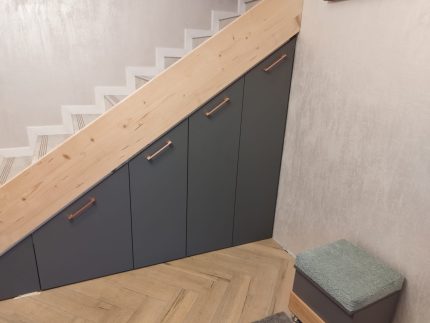 Sistem de depozitare sub scară – funcționalitate discretă, design integrat Acest sistem de depozitare cu acces deschis sub scară este